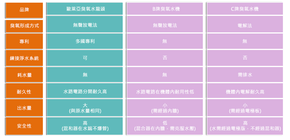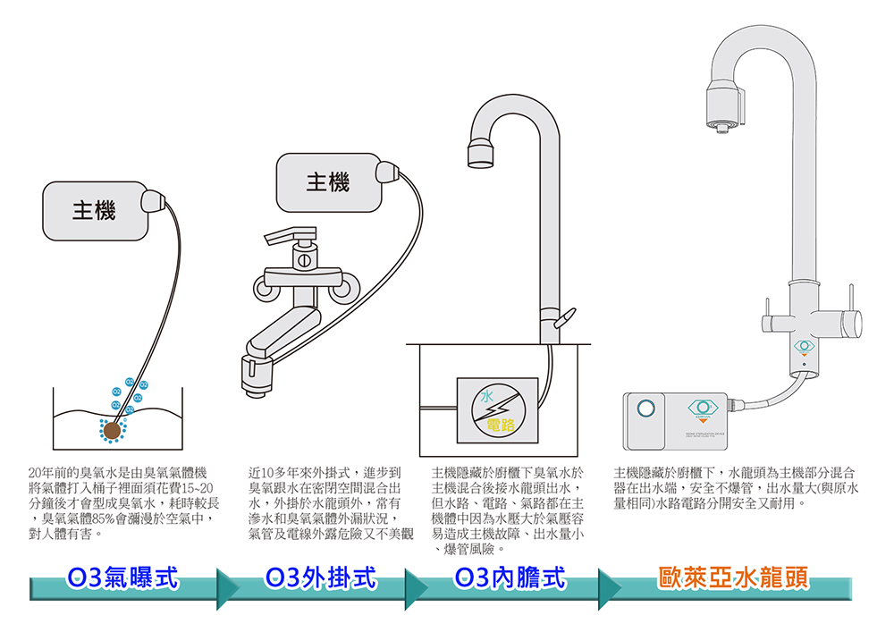 溶於水中的臭氧能停留在水中15~20分鐘之久稱為臭氧水,這段時間內的臭氧水仍然具有殺菌功能,15~20分鐘後臭氧會還原成對人類有益的氧氣,可說是非常環保,沒有汙染。用臭氧水洗手洗臉與漱口可以降低各類傳染病傳播與蛀牙及牙周病的發生還能去除口臭。如果家裡有小朋友的家長常煩惱擔心腸病毒,大腸桿菌等..細菌侵襲小朋友,若常用臭氧水洗手不用再擔心細菌找上門,臭氧能在 5~20秒間殺死細菌,殺菌力非常強經SGS檢測殺菌力達99.999%以上。 皮膚新陳代謝主要是靠血液中的養份及氧氣的供應,皮膚的角質層過厚會引起各類細菌的繁殖,輕者影響皮膚的美觀及皮膚老化,重者會引以各類皮膚病變,臭氧具有殺菌、消毒、脫臭及分解汙垢的能力,可使老化的皮膚迅速汰舊換新,逐漸恢復皮膚的正常功能。