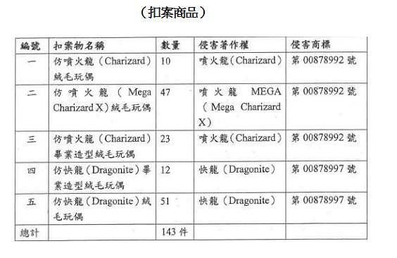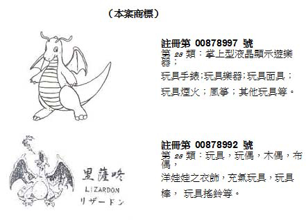 - 本案商標是日商任天堂公司向智財局註冊,指定用於玩具、玩偶、布偶、填充玩具等商品,並分別經核准註冊如附表二所示商標, 而本案扣案物均為立體玩偶,而吊牌上亦記載「品名:填充玩具」, 可見扣案物確為玩具、玩偶、填充玩具。而扣案如附表三編號四、五所示之玩偶,與附表二編號二所示之商標,均為恐龍外型、頭頂有觸角、背後有翅膀及腹部有條紋圖案,且手掌及腳掌上均有爪子等近似之外觀特徵;另附表二編號一所示商標,與附表三編號一至三所示玩偶,均為恐龍外型、有耳朵、翅膀於背部,且手掌及腳掌上均有爪子、腹部範圍與身體有區隔等近似之外觀特徵, 可佐,雖扣案物之玩偶部分造型(即附表三編號二玩偶側邊有火焰造型)、部分衣著、配飾(即如附表三編號三、四玩偶為畢業造型)與如附表二編號一商標圖樣不同,或做成 Q 版之玩偶(即如附表三編號一之玩偶),惟其予人整體視覺印象仍屬近似,故本案商標係以文字、圖形組成之平面圖樣,其雖非立體形狀之商標,惟本案商標指定使用於玩偶商品,與本案扣案物係同一商品;且 本案商標與本案扣案物構成近似。